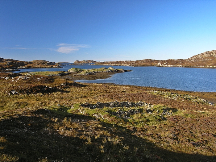 A single house with a kiln in the foreground, and the double house by the shore